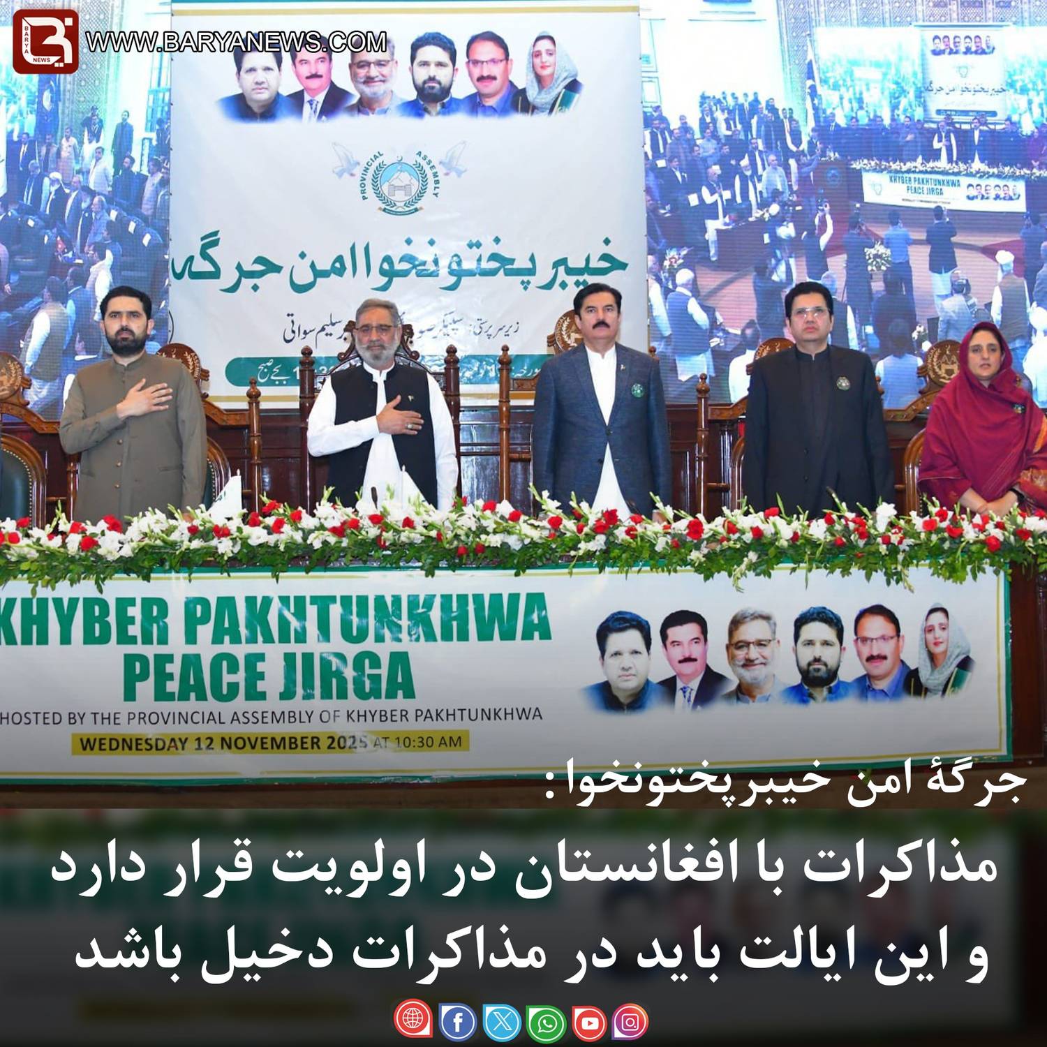 بریانیوز:(۲۴ عقرب/لړم) اجلاس امن ایالت خیبر پختونخوا با صدور بیانیۀ ۱۵ بندی، بر ضرورت گفتوگو با افغانستان و بهبود روابط تجاری با افغانستان تأکید کرد.