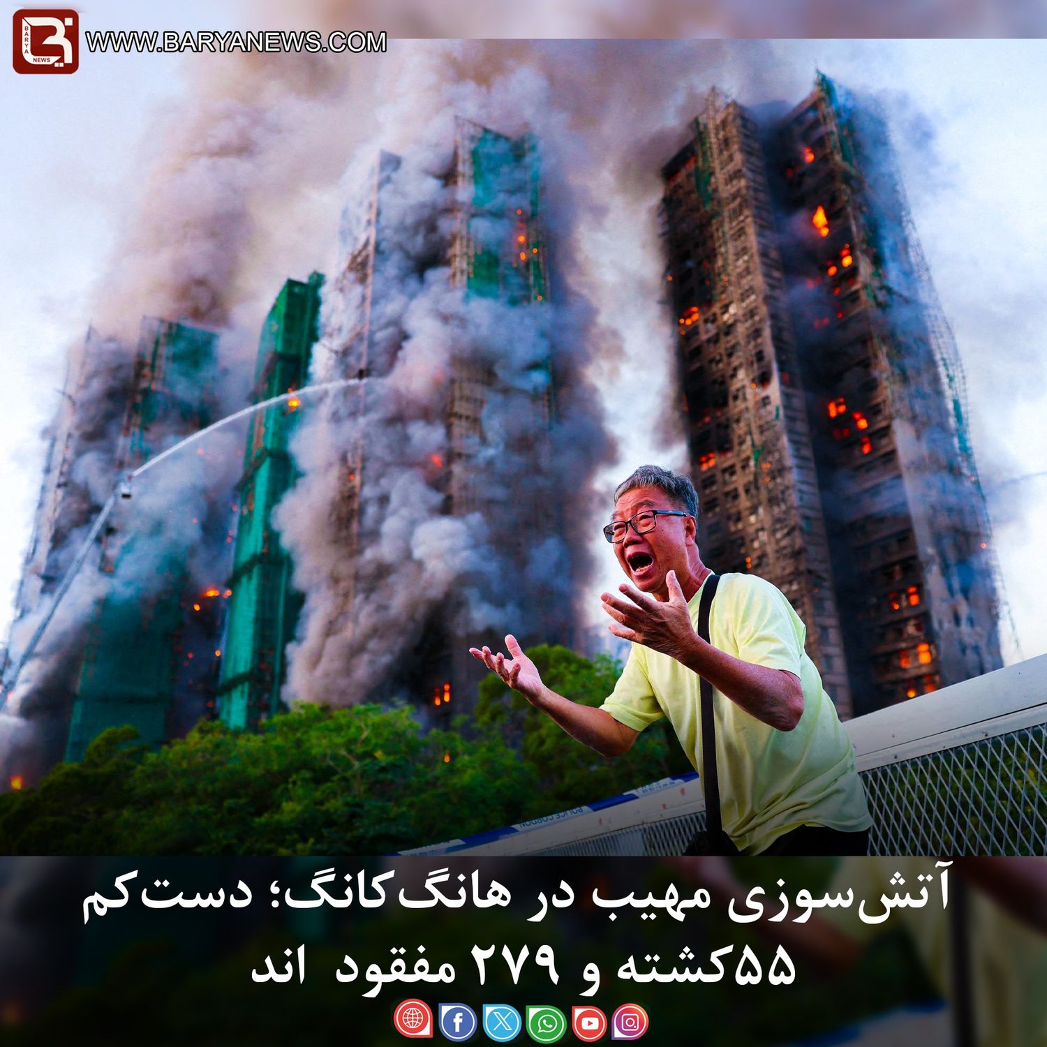 بریانیوز: (۶قوس/ لیندی) در پی آتشسوزی گستردۀ در مجتمع مسکونی وانگ فوک در منطقه تای پو هانگکانگ دستکم ۵۵ قربانی برجای گذاشت و ۲۷۹ نفر هنوز مفقود هستند. بیش از ۷۶۰ آتشنشان برای مهار شعلههای عظیم آتش به صحنه اعزام شدند و تحقیقات برای تعیین علت حادثه آغاز شده است.