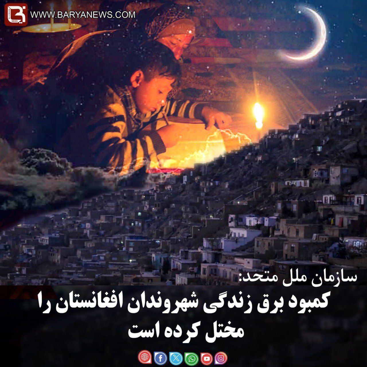 بریانیوز:(دوشنبه، ۲۴ قوس ۱۴۰۴) برنامۀ اسکان بشری سازمان ملل متحد (UN-Habitat) با انتشار پیامی در صفحه رسمی خود در شبکۀ اجتماعی ایکس اعلام کرد که بسیاری از شهرهای افغانستان با کمبود شدید برق مواجهاند؛ مشکلی که تأثیر مستقیم بر زندگی خانوادهها، فعالیتهای اقتصادی و آموزش کودکان گذاشته است.