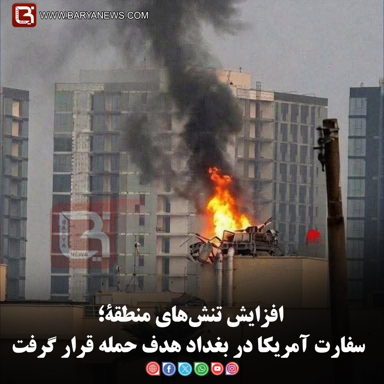 بریانیوز:(یکشنبه،۲۴حوت۱۴۰۴) تصاویر منتشرشده در شبکههای اجتماعی نشان میدهد که ساختمان سفارت ایالات متحده در بغداد، پایتخت عراق، روز شنبه ۲۳ حوت هدف حمله قرار گرفته و دود غلیظی از این ساختمان بلند شده است. گزارشها حاکی از آن است که این آتشسوزی پس از برخورد یک پرتابه انفجاری به محوطه سفارت رخ داده است.