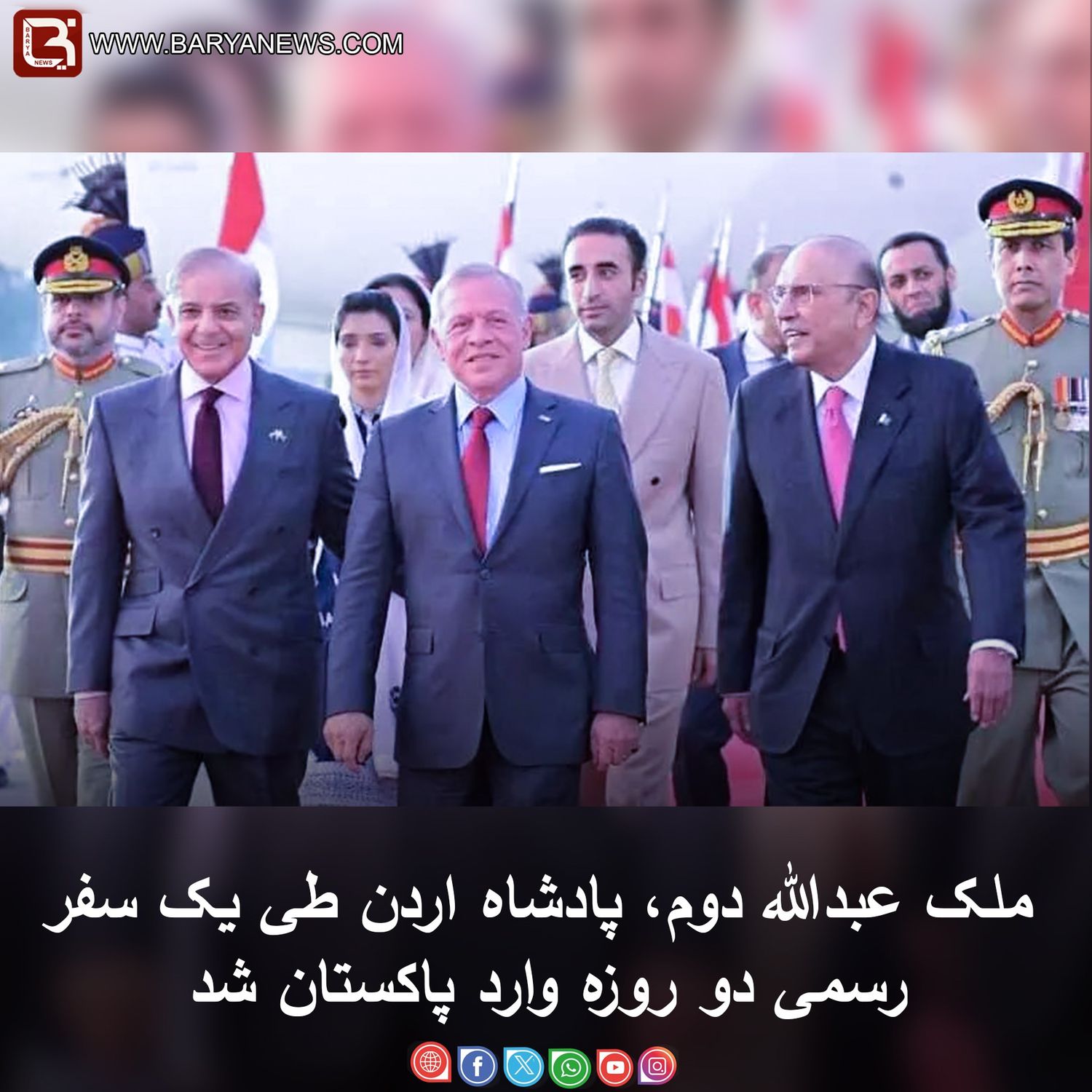 بریانیوز:(۲۵عقرب/لړم) ملک عبدالله دوم، پادشاه اردن، عصر دیروز (شنبه، ۲۴ عقرب) در یک سفر رسمی دوروزه وارد اسلامآباد، پایتخت پاکستان شد. به گزارش «جیونیوز»، آصفعلی زرداری، رئیسجمهور پاکستان و شهباز شریف، نخستوزیر این کشور، در پایگاه هوایی نورخان در راولپندی از او استقبال کردند.