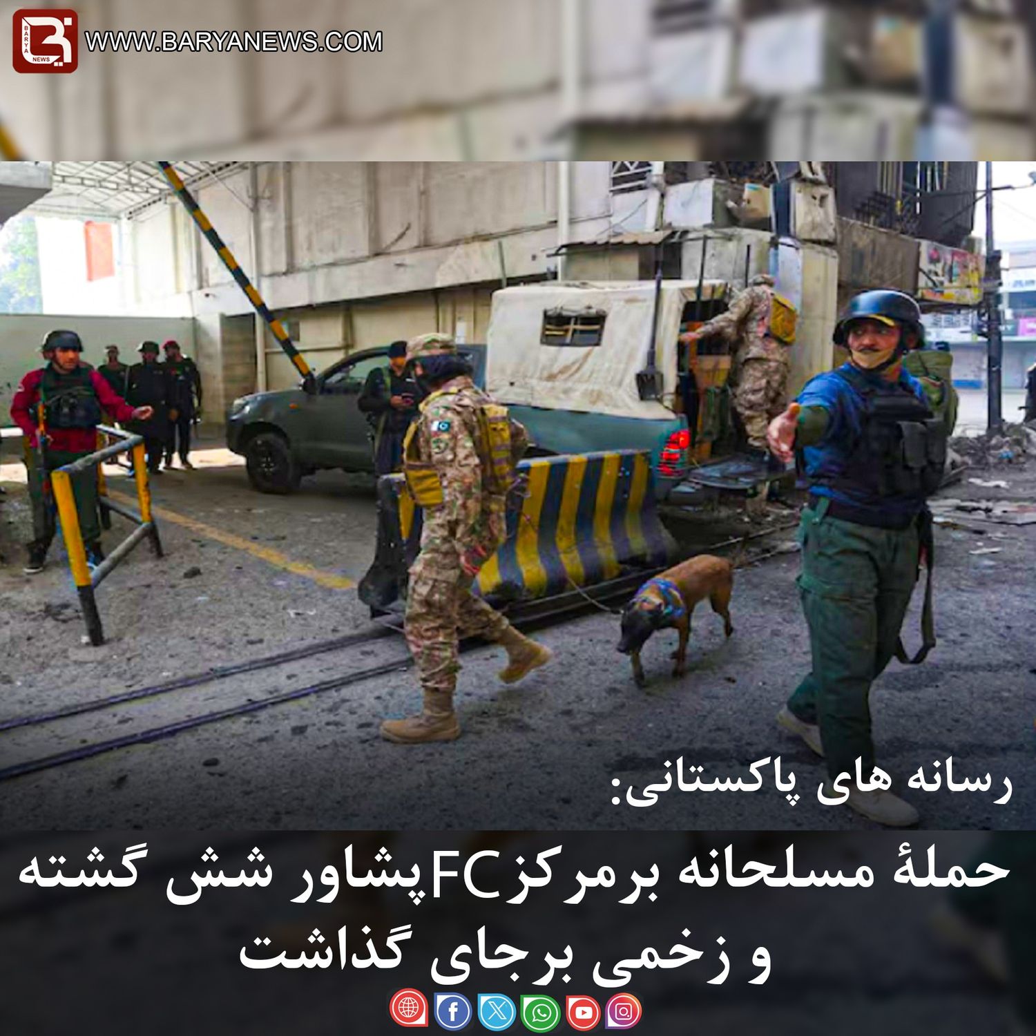 بریانیوز:(۳قوس/لیندی) صبح امروز، یک حملۀ مسلحانه به مرکز نیروهای FC پاکستان در جادۀ کوهات شهر پیشاور صورت گرفت. طبق گزارشهای رسانههای پاکستانی، مهاجمان ابتدا دروازۀ این مرکز نظامی را منفجر کردند و سپس با نیروهای حاضر در مرکز درگیر شدند.