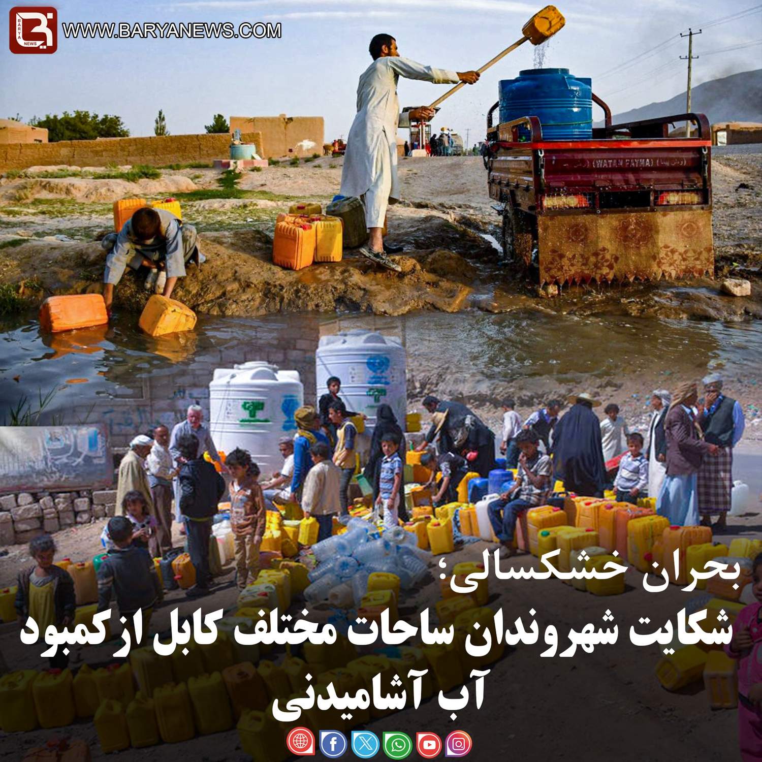 همچنان، یکی از ساکنان شهرک اتفاق در ساحۀ دشت برچی کابل در گزارشی به خبرگزاری بریا، از بحران کمآبی و نبود دسترسی به آب آشامیدنی سالم در این محله خبر داد. به گفته این شهروند، مردم برای تأمین آب مجبورند مسافت زیادی را پیاده یا با وسیله نقلیه طی کنند و بشکههای آب را از نقاط دور پر نمایند.